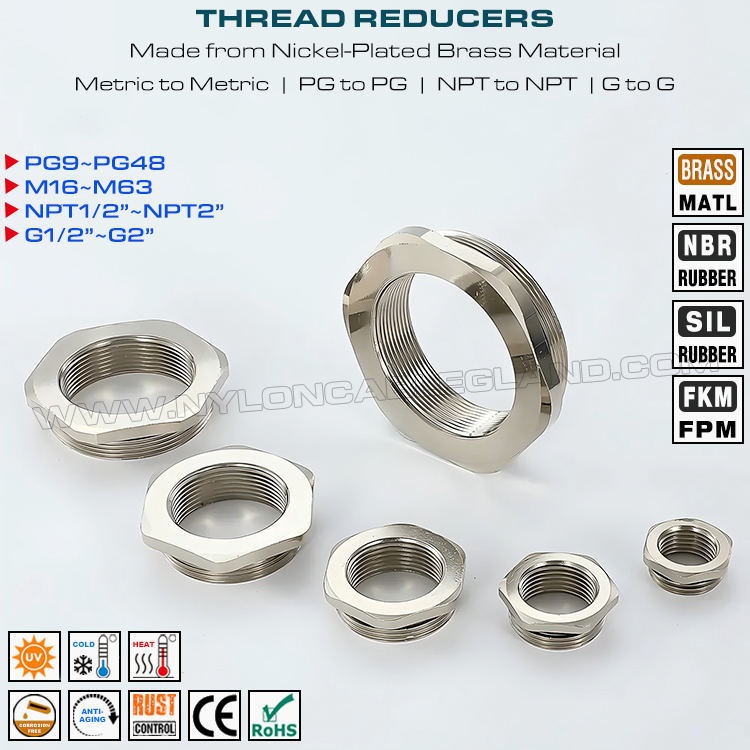 | اسم المنتج | مخفضات ملولبة IP68 (محولات، محولات، تخفيض الخيوط، تجهيزات تخفيض) بخيوط PG أو Metric أو NPT أو G |