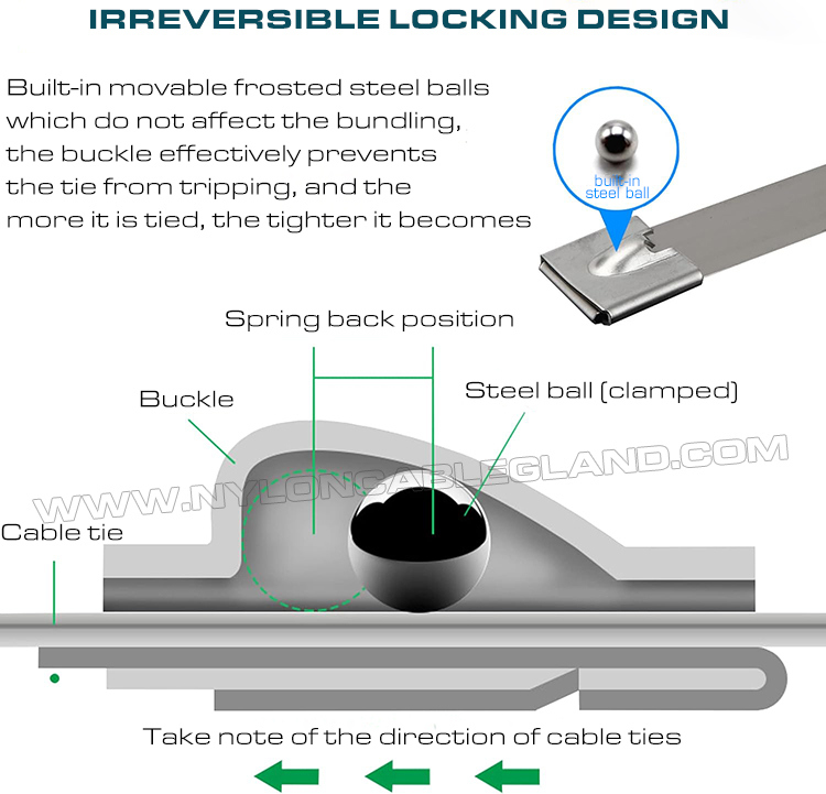 أربطة الكابلات المصنوعة من الفولاذ المقاوم للصدأ، والمعروفة أيضًا باسم أربطة الكابلات المعدنية، هي نوع من أحزمة التثبيت المصنوعة من الفولاذ المقاوم للصدأ عالي الجودة. النوع الأكثر شيوعًا هو أربطة الكابلات المصنوعة من الفولاذ المقاوم للصدأ المزودة بآلية قفل كروي، حيث يسمح رأسها الكروي المصمم بذكاء بالتثبيت بسهولة دون الحاجة إلى أدوات.