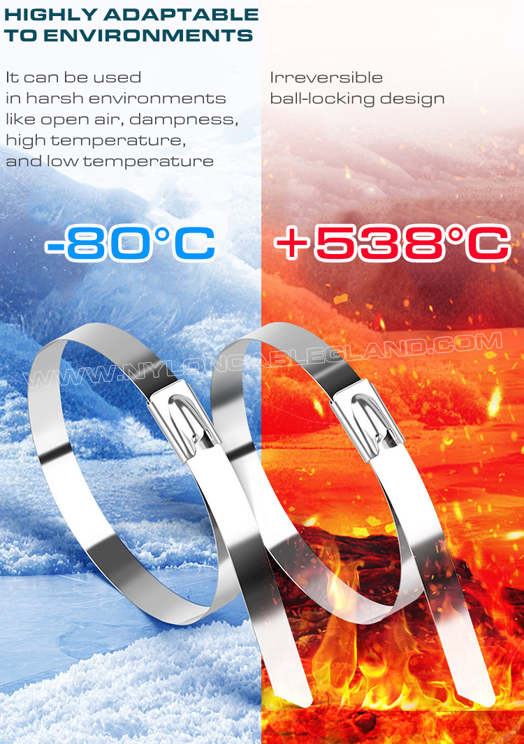 (3) متينة ومقاومة للحرارة - بالمقارنة مع أربطة الكابلات البلاستيكية العادية، تتميز أربطة الكابلات المصنوعة من الفولاذ المقاوم للصدأ بمقاومة للأكسدة والأشعة فوق البنفسجية والمتانة، كما تتميز بمقاومة أفضل للتآكل والصدأ والعوامل الجوية والمواد الكيميائية، وتوفر حماية ممتازة في البيئات المسببة للتآكل.