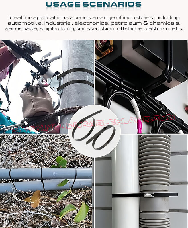 | التطبيقات: | تستخدم على نطاق واسع لربط الكابلات والأسلاك والأنابيب والنباتات أو أشياء أخرى في صناعة الكهرباء والإلكترونيات والإضاءة والأجهزة والأدوية والكيميائية والكمبيوتر والآلات والزراعة ، إلخ. |